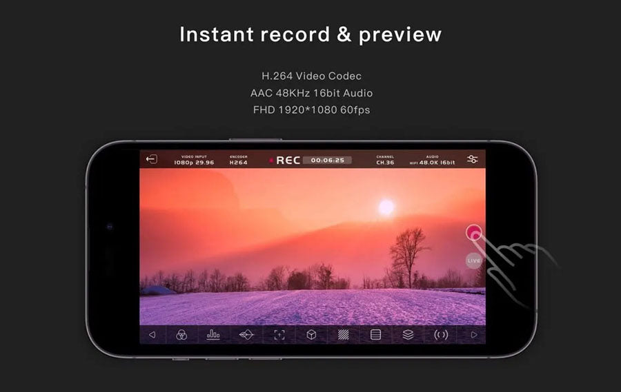 O SeeMo também pode gravar um vídeo H.264 HD diretamente de sua câmera para o rolo da câmera do seu iPhone ou iPad. Otimizados para tamanho e conveniência, esses arquivos têm taxa de bits variável de 30 Mb/s em 8 bits. Você também pode usar isso como um backup para a filmagem principal em sua câmera ou até mesmo usá-los para editar vídeos quando o tempo for essencial.