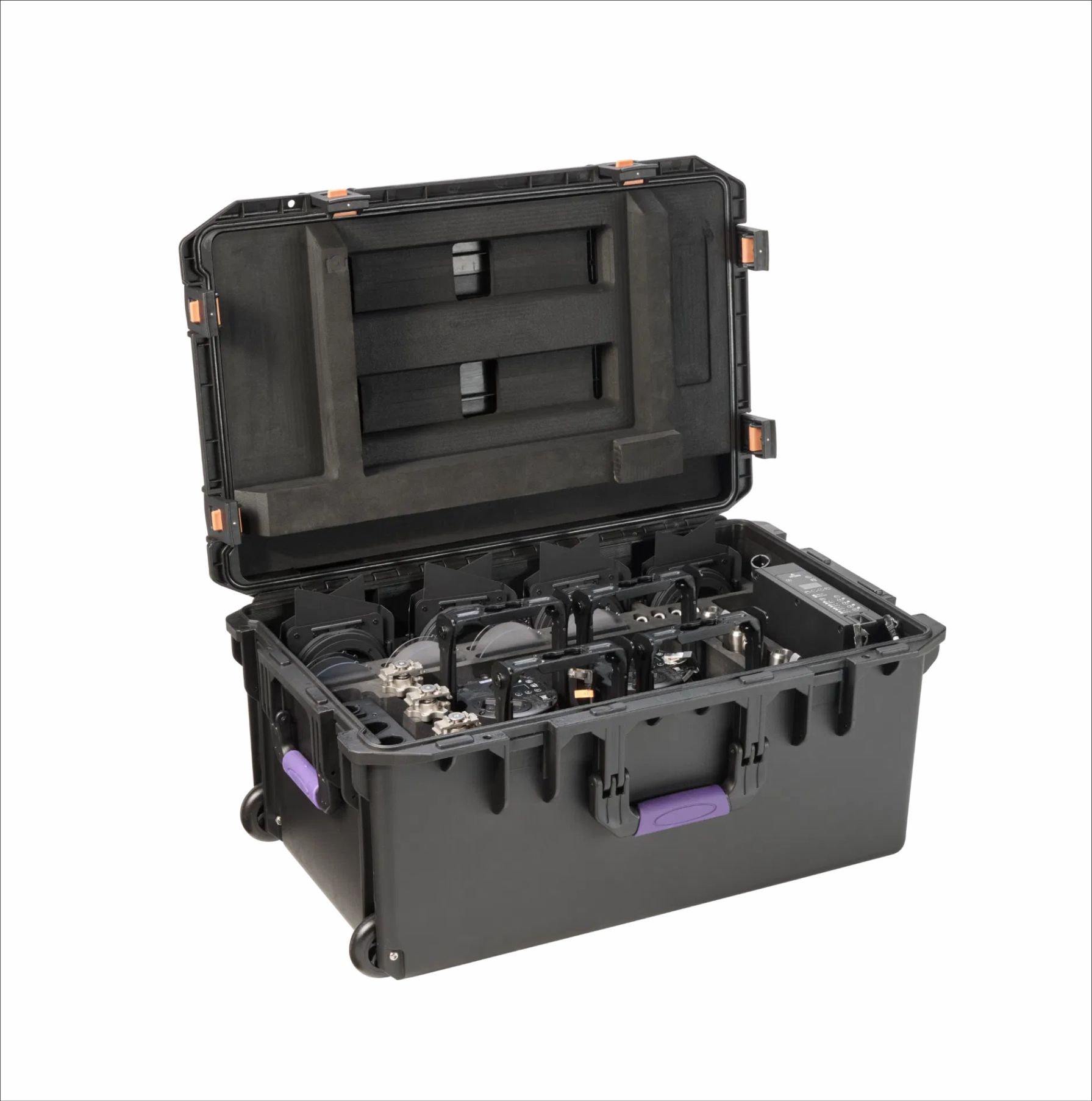 Conjunto de 4 QuikBeams com acessórios versáteis armazenados em um estojo protetor resistente. Inclui 4 Barndoors, uma NetBox, filtros, cabos e acessórios de montagem, mantendo seu equipamento organizado, protegido e pronto para uso.